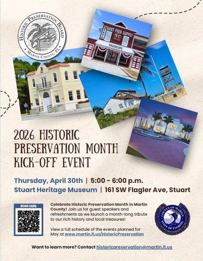 The Martin County Historic Preservation Board will kick off Historic Preservation Month 2026 alongside its Partners in Preservation at the Stuart Heritage Museum (behind the 1901 Stuart Feed Store that is on the City of Stuart Historic Register) at 161 SW Flagler Ave., Stuart. Hear from Martin County and City of Stuart speakers and enjoy light refreshments.